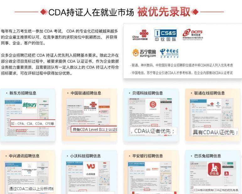 企业青睐:很多企业在招聘数据分析相关岗位时,会明确标注“CDA持证人优先”。特别是在银行、金融机构的技术岗位,往往要求应聘者至少持有CDA二级证书。中国联通、央视广信、德勤、苏宁等知名企业,都将CDA持证人列入优先考虑范围,甚至为员工考取CDA证书提供补贴。