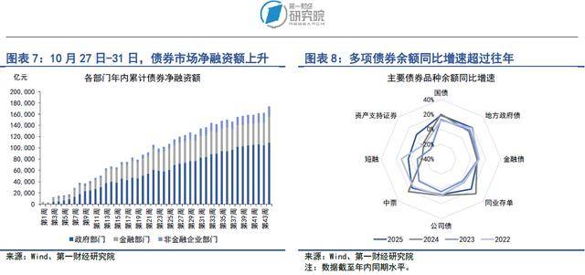 从债券余额增速来看,今年多项债券余额同比增速超过往年同期。截至10月31日,政府部门债券余额同比增速为19%,较2024年同期上升3.2个百分点;金融部门债券余额同比增速为11.6%,较2024年同期下降1.6个百分点;非金融企业部门债券余额同比增速为7%,较2024年同期增速上升0.9个百分点。