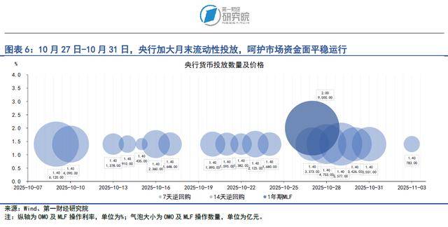 10月最后一周,央行扩大流动性投放以呵护市场资金面平稳运行。在10月27日至31日当周,央行共通过7天逆回购投放资金2.07万亿元,共有8672亿元逆回购到期,净投放资金1.2万亿元。