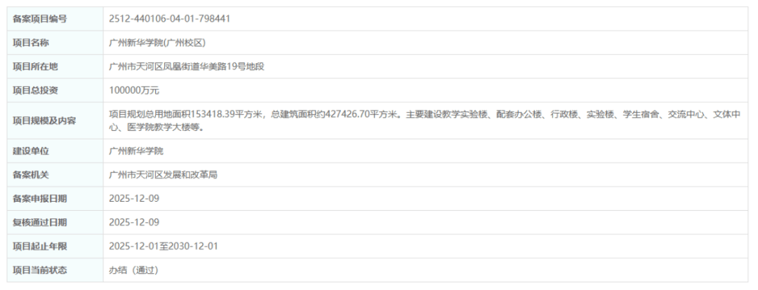 据广州市天河区发改局备案信息显示,广州新华学院计划投资10亿元扩建广州校区。主要建设内容包括教学实验楼、医学院教学大楼、学生宿舍、行政楼与配套办公楼,以及交流中心、文体中心等设施,以进一步完善办学条件。