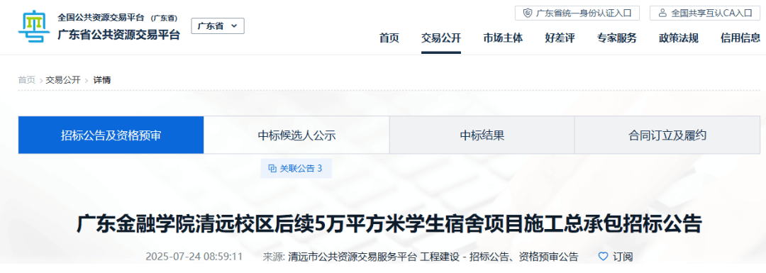据广东省公共资源交易平台信息,广金清远校区计划新建4栋宿舍楼,总建筑面积约5万平方米,施工总工期480天。