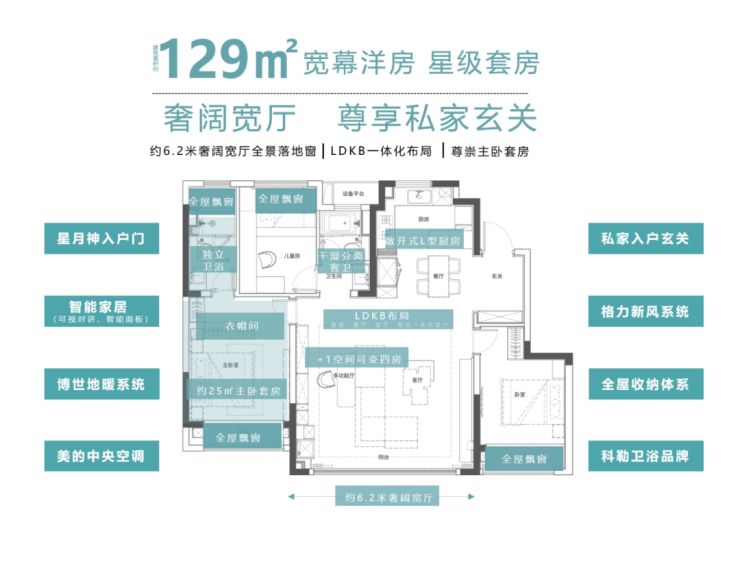 约129㎡宽幕洋房:打造星级主卧套房,尺度阔绰,尽显改善生活的从容与尊崇。