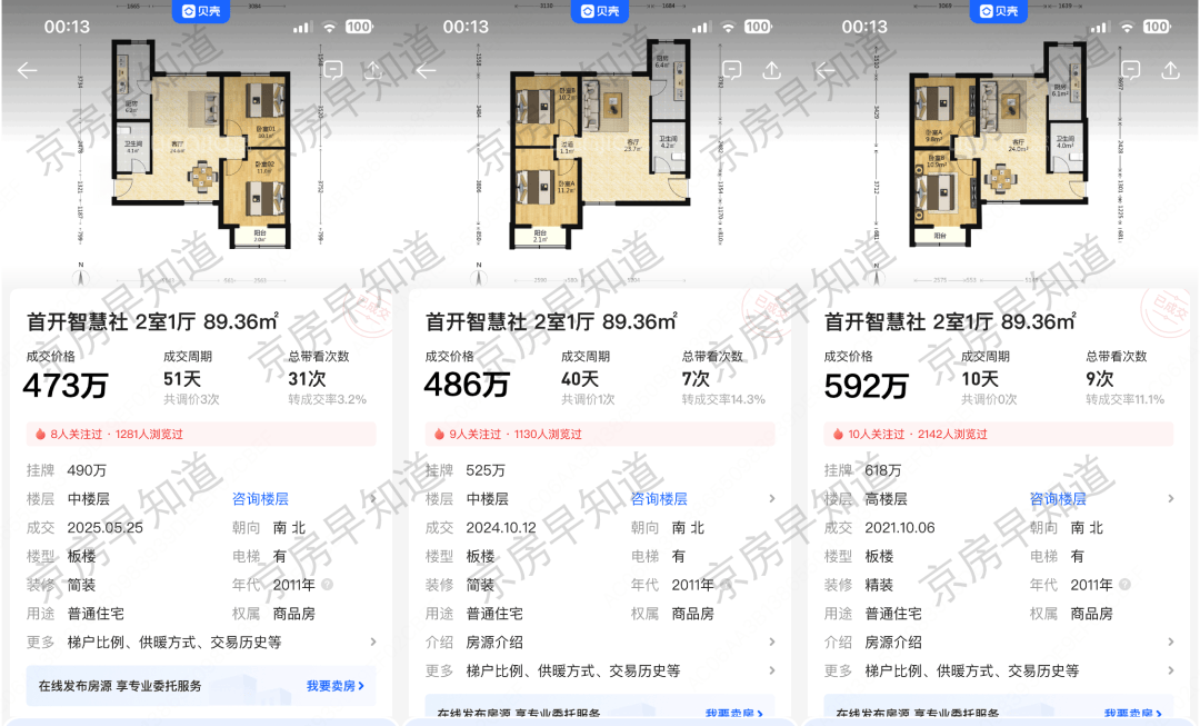 首开智慧社在2026年1月成交了一套89㎡的2居室,成交价340万。同户型在2021年10月成交价是592万,降价了252万,幅度43%。
