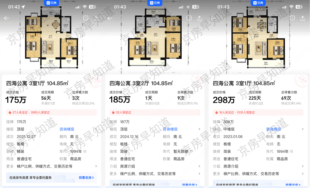 四海公寓在2025年12月成交了一套104㎡的3居室,成交价175万。同户型在2023年1月成交价是298万,降价了123万,幅度42%。