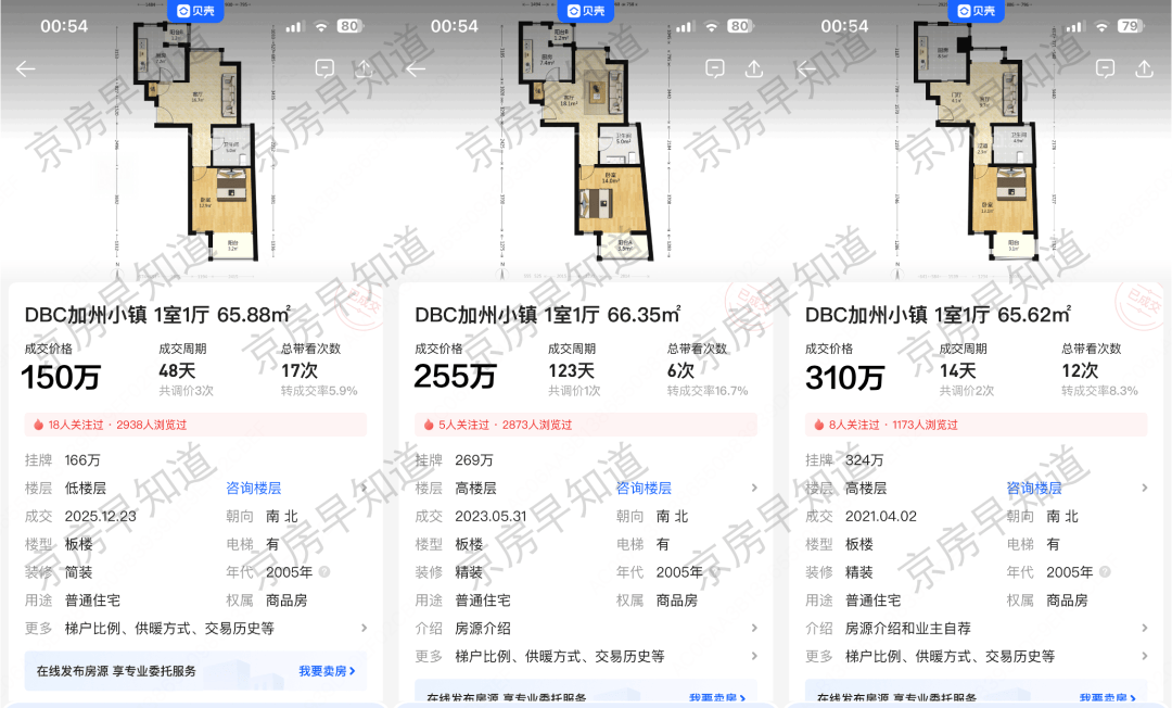 DBC加州小镇在2026年1月成交了一套65㎡的1居室,成交价166万。同户型在2017年3月成交价是405万,降价了239万,幅度60%。