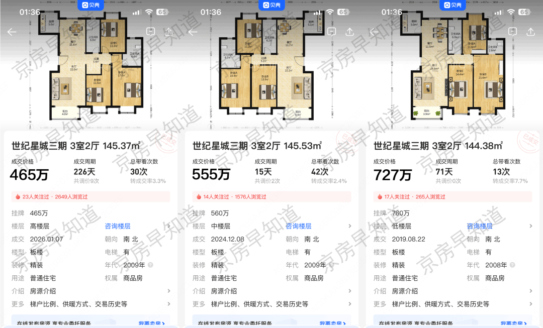 世纪星城三期在2026年1月成交了一套145㎡的3居室,成交价465万。同户型在2017年2月成交价是770万,降价了305万,幅度40%。