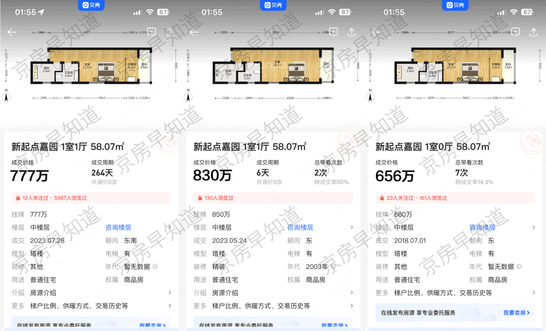 新起点嘉园在2026年2月成交了一套58㎡的1居室,成交价575万。同户型在2021年2月成交价是1083万,降价了508万,幅度47%。
