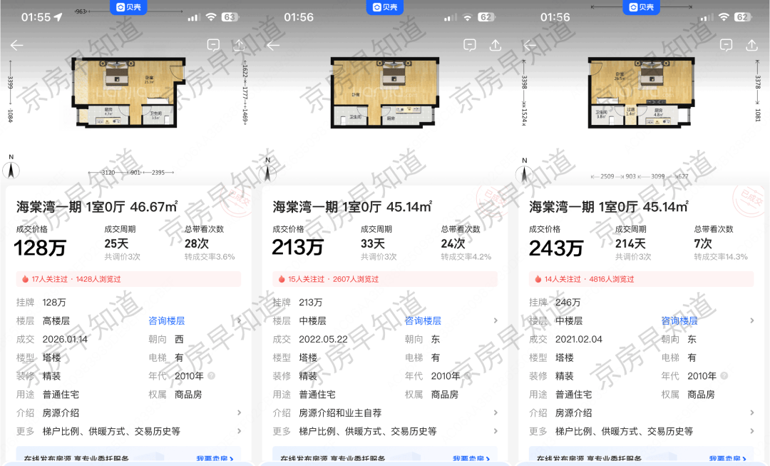海棠湾一期在2026年1月成交了一套46㎡的1居室,成交价128万。同户型在2018年10月成交价是256万,降价了128万,幅度50%。