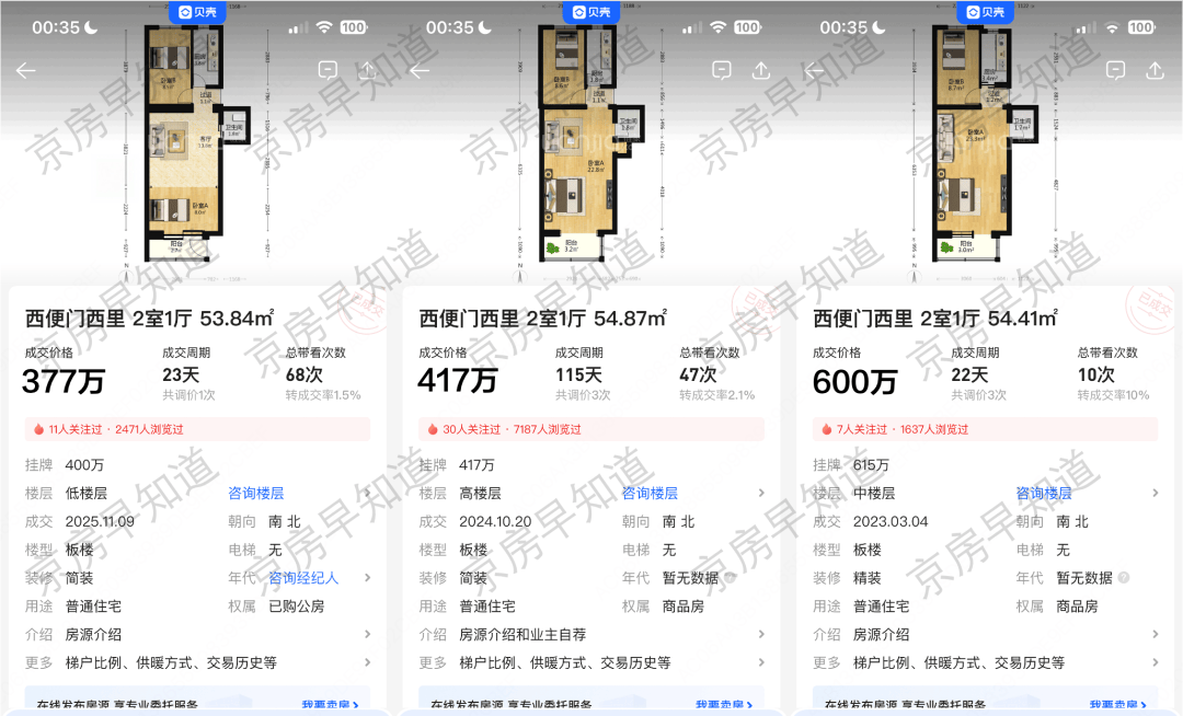 西便门西里在2026年2月成交了一套54㎡的2居室,成交价348万。同户型在2023年3月成交价是600万,降价了252万,幅度42%。