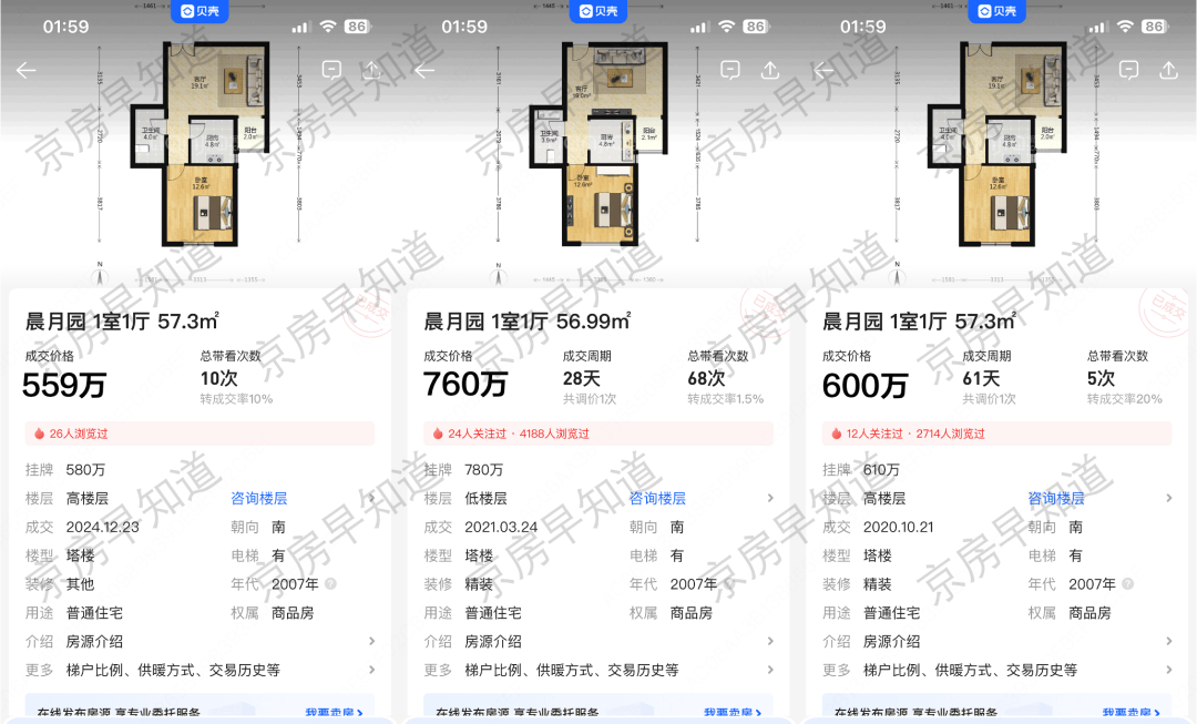 晨月园在2026年1月成交了一套57㎡的1居室,成交价415万。同户型在2021年3月成交价是760万,降价了345万,幅度46%。