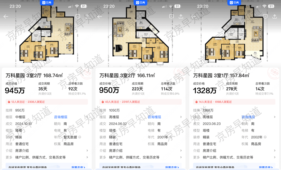 万科星园在2026年1月成交了一套168㎡的3居室,成交价是853万。同户型在2017年3月成交价是1360万,降价了507万,跌幅38%。