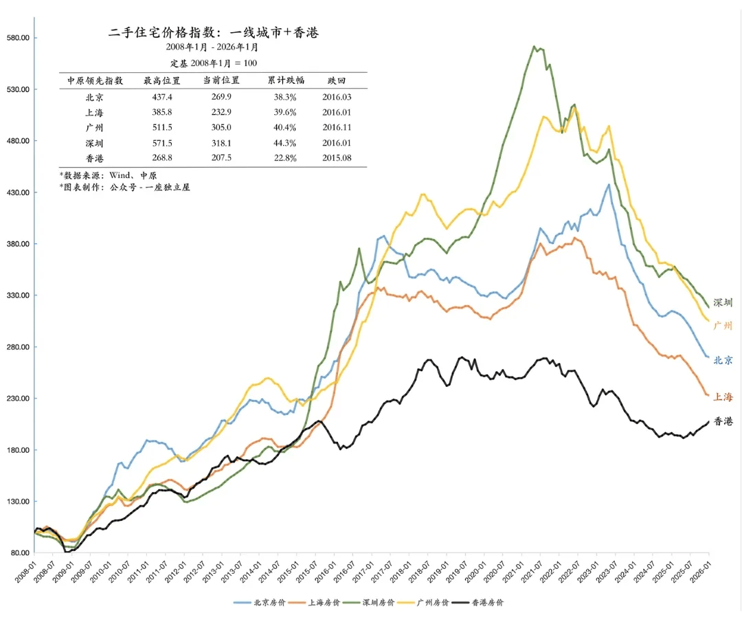 根据Wind公布的数据,当前二手住宅价格指数相比最高点,累计跌幅是38.3%,已经回到2016年3月份的价格水准。