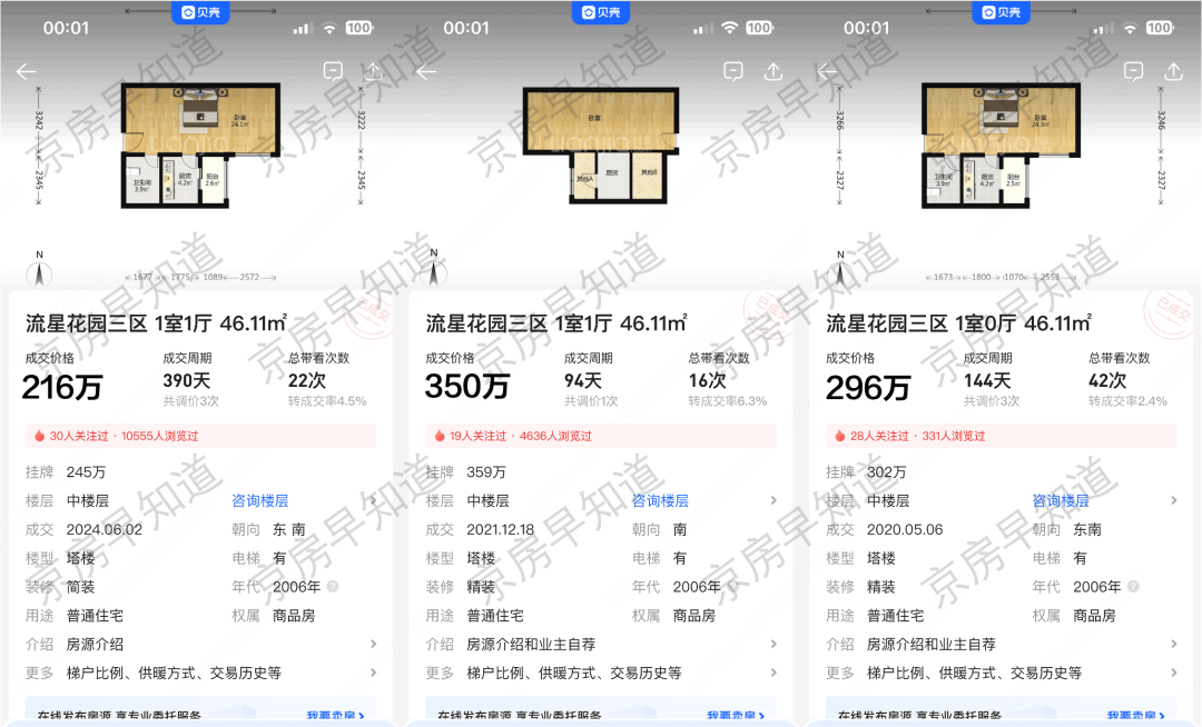 流星花园三区在2026年1月成交了一套46㎡的1居室,成交价157万。同户型在2017年3月成交价是400万,下降243万,跌幅61%。