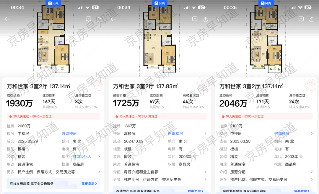万和世家在2026年2月成交了一套137㎡的3居室,成交价1430万。同户型在2023年3月成交价是2046万,降价了616万,幅度31%。