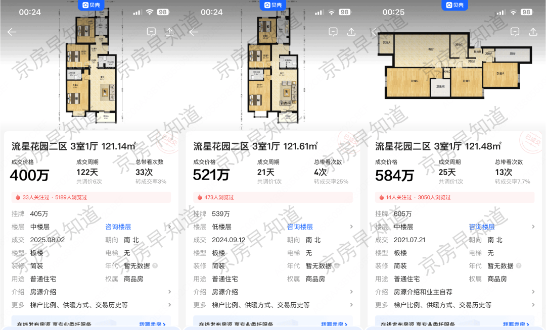 流星花园二区在2026年1月成交了一套121㎡的3居室,成交价355万。同户型在2017年3月成交价是635万,降价了280万,幅度45%。