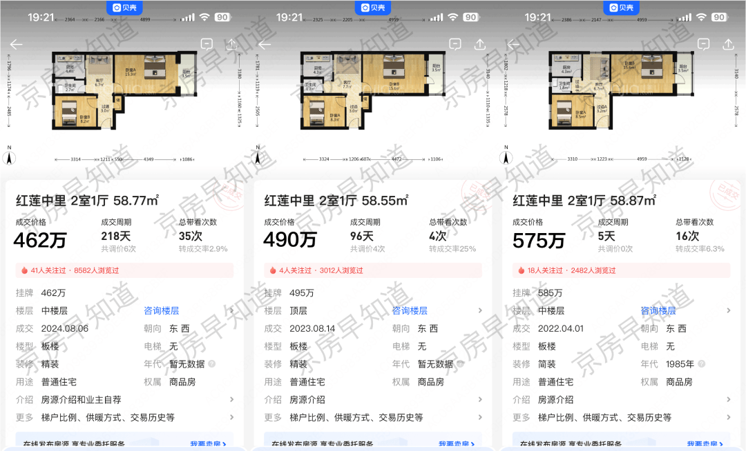 红莲中里在2026年1月成交了一套58㎡的2居室,成交价285万。同户型在2022年4月成交价是575万,降价了290万,幅度51%。