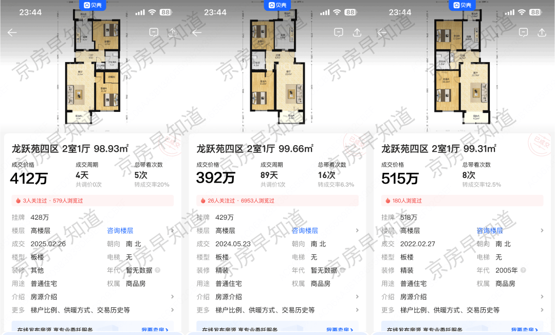 龙跃苑四区在2025年12月成交了一套99㎡的2居室,成交价249万。同户型在2022年2月成交价是515万,降价了266万,幅度52%。