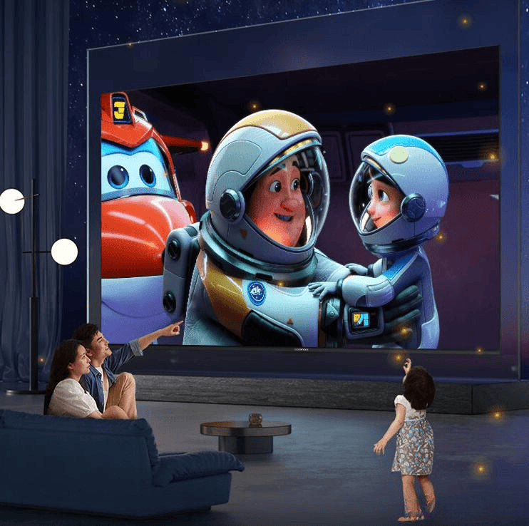 高亮度屏幕,画面亮丽真实,支持护眼,经过德国莱茵认证,有效减少蓝光和频闪,适合全家人一起享受视听时光。