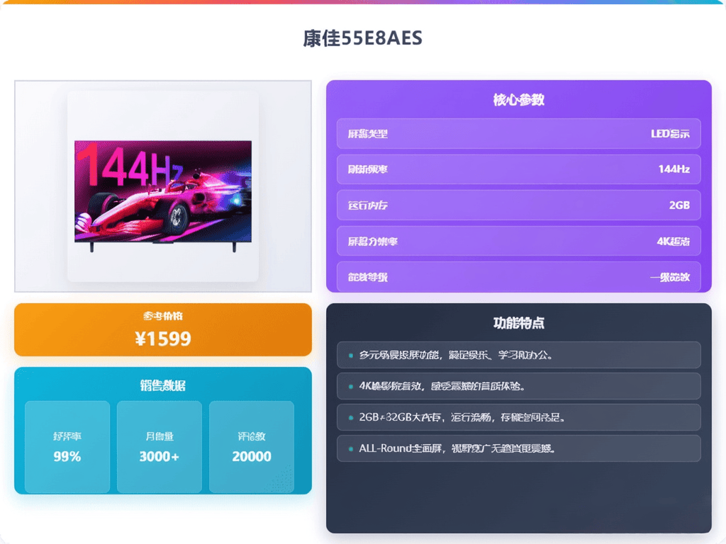 3️⃣节能环保设计:获得二级能效认证,采用节能灯珠和多层光学膜,保证画面亮丽的同时省电,适合追求省电省钱的家庭。