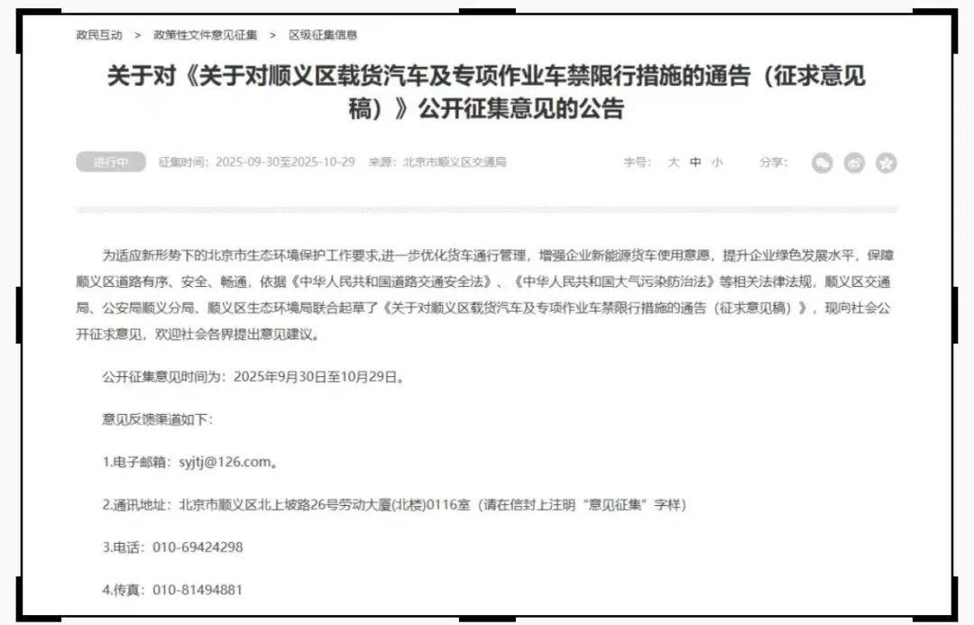 “这12条路段,将拟全天禁止重型载货汽车和专项作业车通行!”据顺义区交通局消息,顺义区交通局、公安局顺义分局、顺义区生态环境局联合起草了《关于对顺义区载货汽车及专项作业车禁限行措施的通告(征求意见稿)》。根据通告内容,裕庆路、白马路、顺平路、右堤路等12条路段,将全天禁止重型载货汽车和专项作业车通行。
