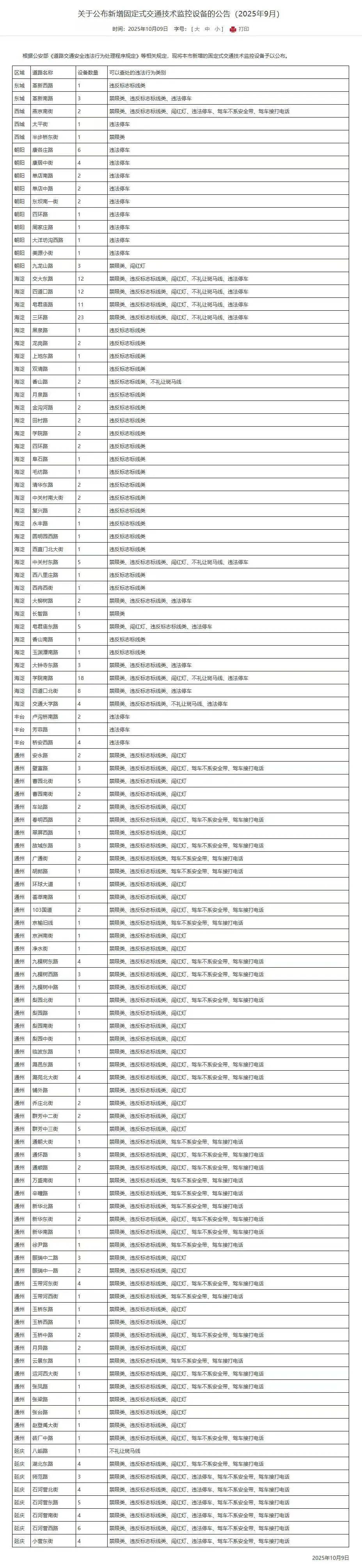 10月9日,北京市公安局公安交通管理局网站发布《关于公布新增固定式交通技术监控设备的公告(2025年9月)》,114处道路新增298个“电子警察”!