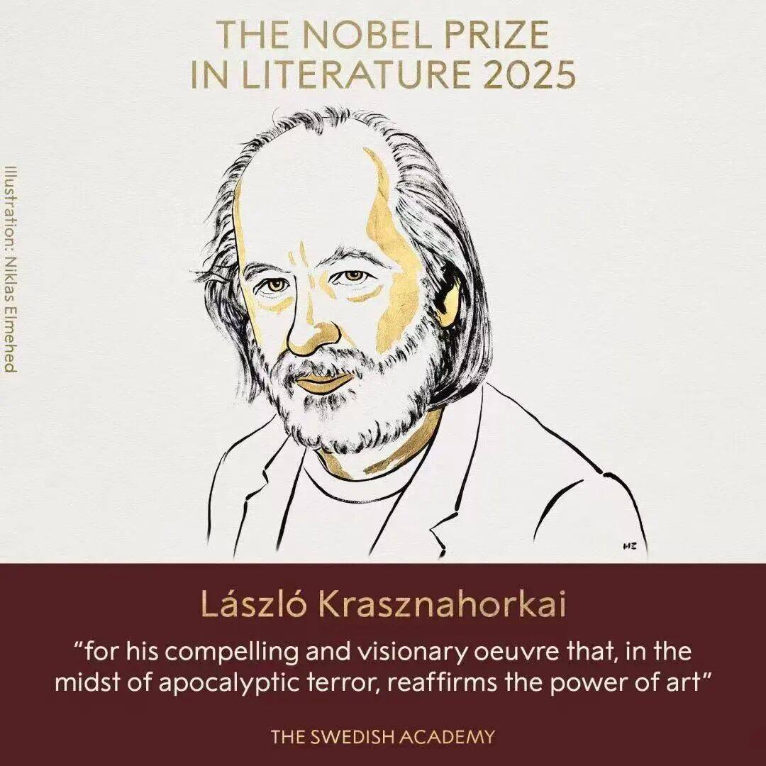 瑞典文学院10月9日宣布,将2025年诺贝尔文学奖授予匈牙利作家拉斯洛·卡撒兹纳霍凯(László Krasznahorkai),获奖理由是“因其引人入胜且富有远见的作品,在末日般的恐怖中,再次彰显了艺术的力量”。