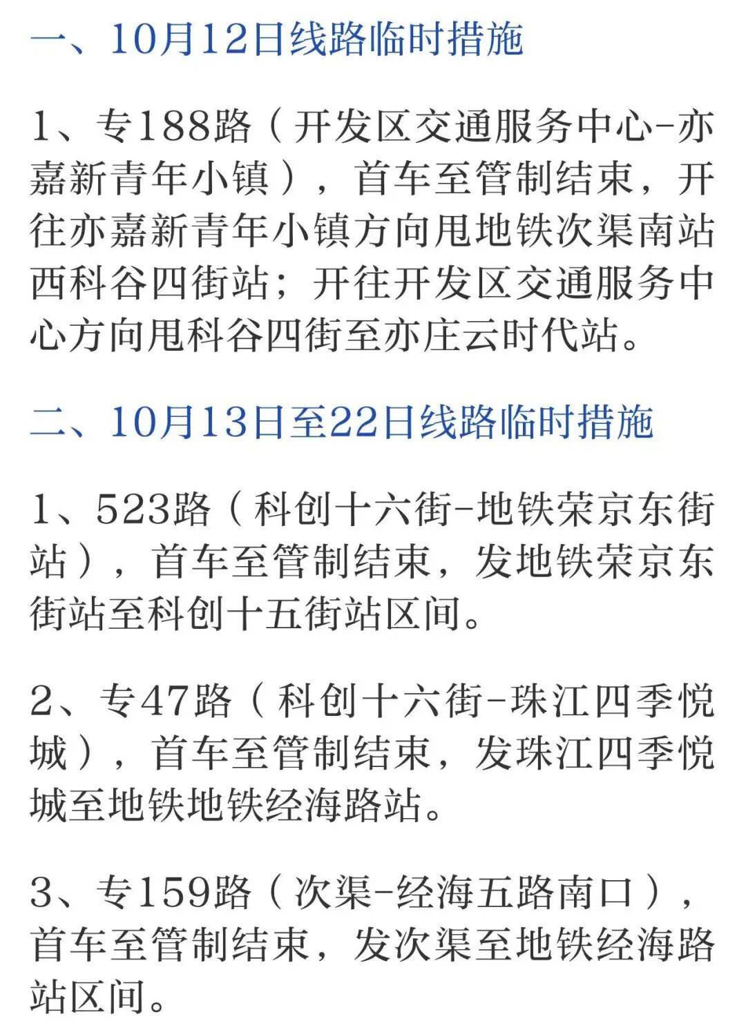 根据亦庄开发区《关于2025GT世界挑战赛·北京亦庄站赛事期间采取临时交通管制措施的通告》有关要求,10月12日0时至10月22日0时赛事举办期间,相关道路将分时、分段采取临时交通管理措施。比赛线条公交线路将不同程度受到影响,届时将采取绕行甩站、区间运营等临时措施。