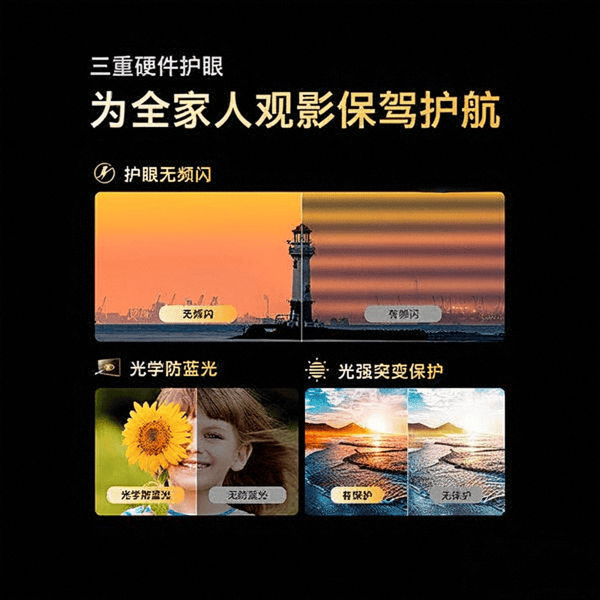 三重硬件护眼技术:这款电视配备三重护眼功能,包括无频闪、光学防蓝光和光强突变保护,大幅降低视觉疲劳。无论是长时间追剧还是打游戏,都能有效保护眼睛健康,让用户安心享受屏幕带来的乐趣。