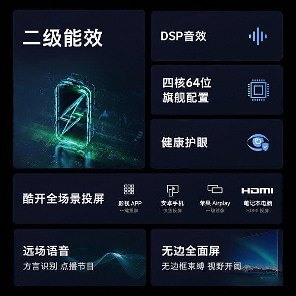 节能环保表现优异:这款电视在节能方面表现突出,每天观看10小时的耗电量不足一度电,既满足了观影需求,又为用户节约能源,体现了环保理念。