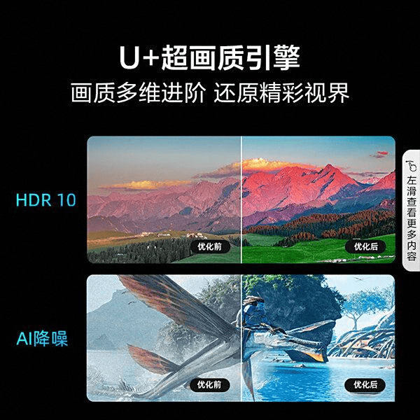U+超画质引擎:这款电视搭载的U+超画质引擎技术,能够显著改善画质,让图像呈现得更加清晰和自然。无论是看电影还是玩游戏,细腻的画质都能带给你身临其境的视觉享受。
